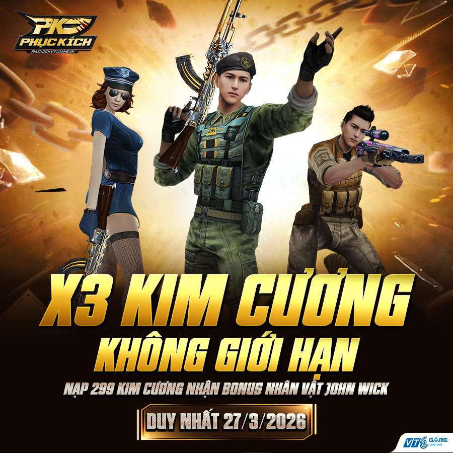 CƠ HỘI SĂN KIM CƯƠNG CỰC HỜI TRONG THÁNG - Nạp 1 nhận về gấp 3 lần số kim cương - BONUS TẶNG THÊM NHÂN VẬT JOHN WICK CHỈ 299 KIM CƯƠNG - duy nhất ngày 27/03. Chi tiết sự kiện X3 kim cương như sau: