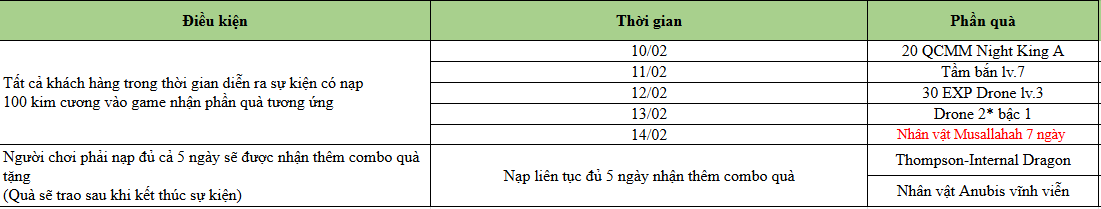 3. Điều kiện tham gia: Trong thời gian diễn ra sự kiện, KH mỗi ngày có nạp từ 100 kim cương trở lên vào game sẽ được nhận phần quà tương ứng của ngày đó