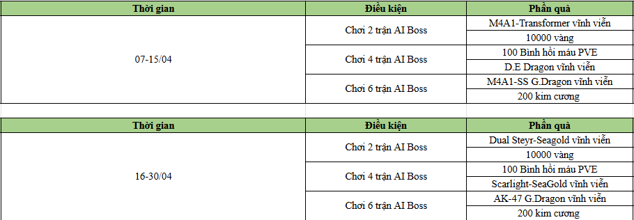 TIẾP NỐI SỰ KIỆN TÌM RA ĐỘI SĂN BOSS CỰC MÁU CHIẾN - Sự kiện ĐẠI CHIẾN AI BOSS tháng 4 dành cho các Xạ thủ có sở thích giao tranh chế độ AI BOSS đây, chi tiết sự kiện như sau: